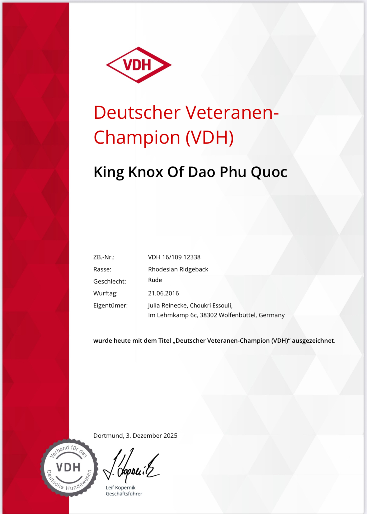 Knoxi hat zwei neue Titel: Deutscher VDH Veteranchampion sowie Club DZRR Veteranchampion